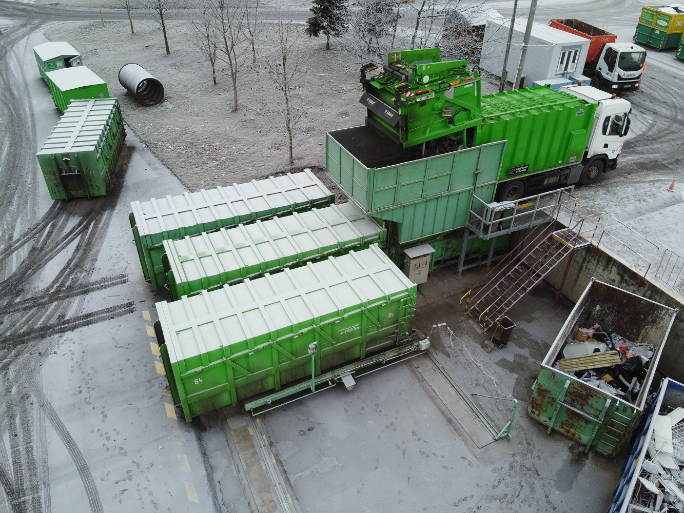 - Перегрузка на МПС. На территории МПС мусоровоз выгружает содержимое в специализированные крупногабаритные контейнеры объемом от 27 до 30 м³ (в некоторых проектах до 36 м³). Перед загрузкой отходы подвергаются обязательному уплотнению (прессованию) с помощью пресс-компакторов. Благодаря этому объем мусора сокращается на 25–35%, что значительно повышает эффективность последующей транспортировки.