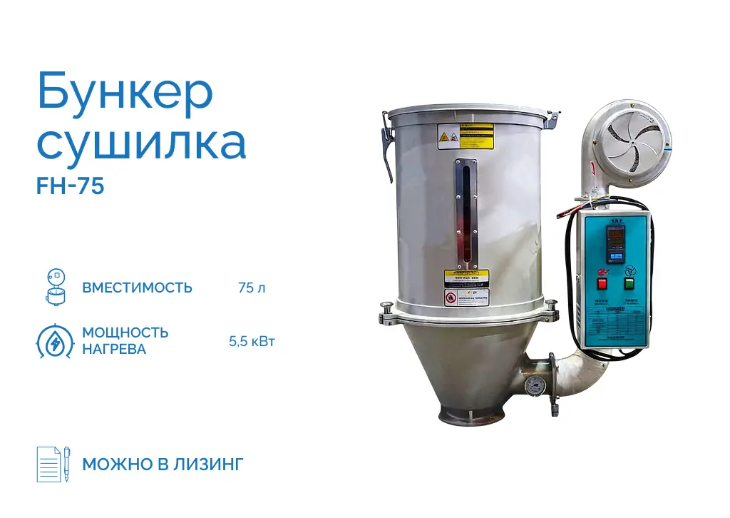 Обьем загружаемого материала 75 л, 5,5 кВт. Вентилятор 0,2 кВт. Сушильные бункеры являются эффективным оборудованием для сушки гранулированных полимерных материалов. Высушивание непосредственно в зоне загрузки машины исключает возможность попадания влаги с материалом.