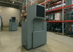 Выдача переработанной пластмассы осуществляется через выгрузной бункер (если отсутствует встроенный шнек) в корзину, последняя часто идет в комплекте. При подключении периферийного оборудования возможно засыпание сразу в мешок или биг-бэг. Работа некоторых станков регулируется шкафом управления.