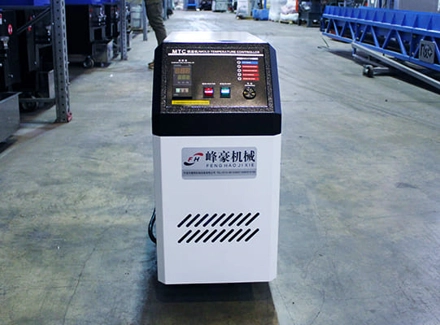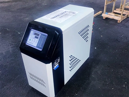 Электрический шкаф термостата отделен от общего корпуса, на передней панели термостата расположен пульт управления, с которого совершается настройка параметров работы. При включении насоса перекачки теплоноситель (вода) поступает в герметичный блок нагрева, где соприкасаясь с поверхностью электрических нагревателей, доходит заданной температуры. При достижении заданной t нагрев теплоносителя автоматически завершается. Из блока нагрева теплоноситель поступает в трубопровод, к которому подключается термостатируемый объект (пресс-форма), для регулировки давления подаваемого теплоносителя на нагнетающем трубопроводе смонтирован байпасный кран.