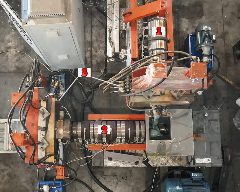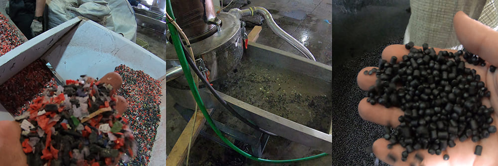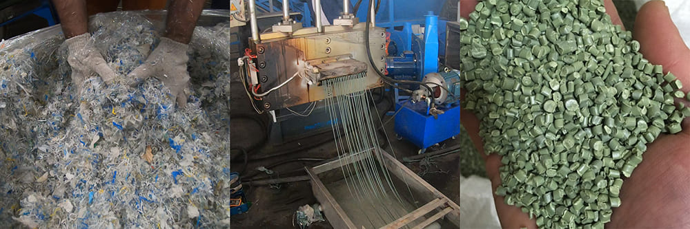 Благодаря оказываемым нагрузкам полимер постепенно деформируется, расплавляется, смешивается с красителями, смолой и прочими добавками, доводится до однородного состояния и затем выдавливается сквозь головку заданной формы. На выходе выполняется нарезка гранул и их охлаждение. Готовый гранулят фасуется по биг-бегам и отправляется на хранение, продажу или дальнейший этап производства изделий из вторсырья.